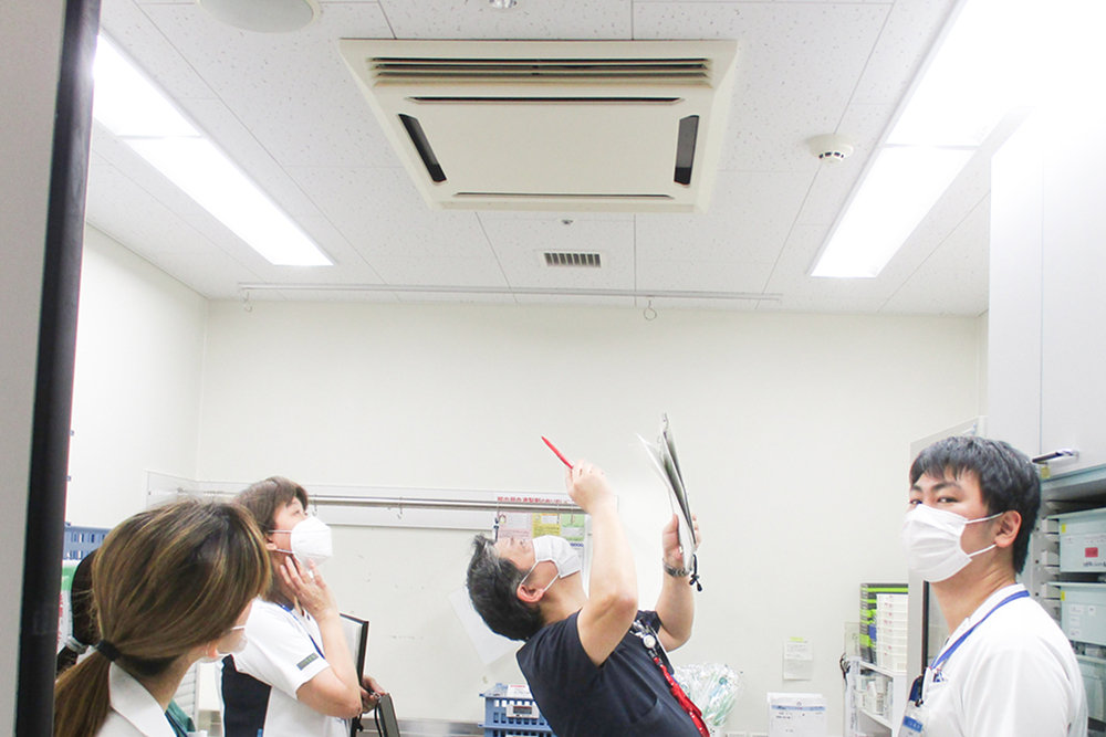安全な療養環境を守るため、多職種で院内を巡回し、感染対策の徹底を確認しています。専門知識を持つメンバーが現場の課題を吸い上げ、具体的な対策をアドバイス。スタッフ全員が高い意識で感染予防に取り組めるよう、知識の共有と実践的な指導を行っています。